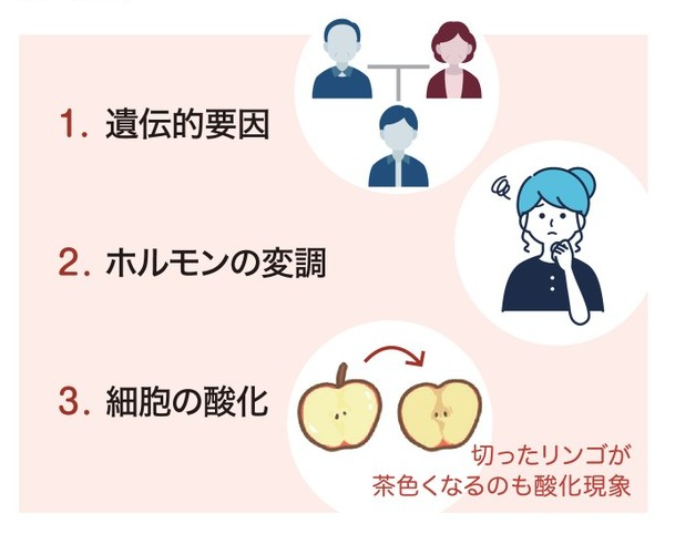 私たちの体が老化する原因は、大きく分けて「遺伝」「ホルモンの変化」そして「細胞の酸化」の3つがあると言われています。