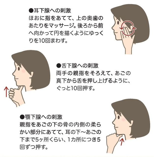 舌下腺(ぜっかせん)への刺激: あごの骨の内側の柔らかい部分に親指を当て、耳の下からあごの先までを数カ所に分け、それぞれ5回ずつ押します。