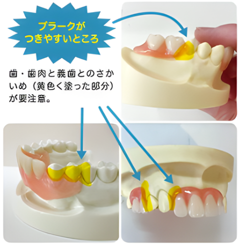 1.義歯の維持装置 「クラスプ」や「精密アタッチメント」など、義歯を支える金具や装置の周り(図の黄色い部分)は、プラークがつきやすく取れにくい、特に気をつけたい部分です 。 また、「歯・歯肉と義歯とのさかいめ」もプラークがたまりやすいため要注意です 。