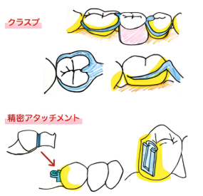 部分入れ歯には、お口の中に固定し安定させるための「維持装置」がついています 。これは主に、歯が欠損した部分の隣の歯に取り付けられており、「クラスプ」「精密アタッチメント」「テレスコープクラウン」といった種類があります 。
