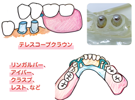 2.複雑な装置 「テレスコープクラウン」や「リンガルバー」など、構造が複雑な装置を装着している場合、入り組んだ歯並びと同様に、お手入れが難しくなります 。義歯に組み込まれた維持装置にもプラークは付きますので、忘れないよう丁寧に清掃してください 。