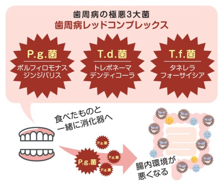 これらの中には、当然ながら歯周病菌などの悪玉菌も含まれます。 もし、病原菌である歯周病菌が食べ物と一緒に飲み込まれ、胃酸で殺菌しきれなかった場合、それらは生きたまま腸へ運ばれてしまいます。ここで見過ごせない2つの重大なリスクがあります。