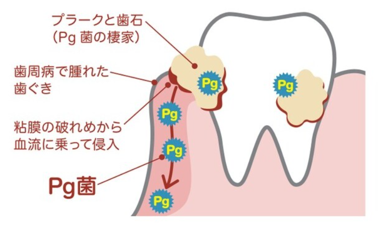 特に、歯周病の3大病原菌である『PG菌』は、歯周ポケットの深い場所で繁殖し、血液をエサにします。そのため、血管を通じて容易に体内へ侵入してしまうのです。